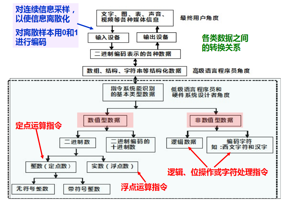 从外部形式来看,计算机可以处理数值,文字,图,声音,视频等各种模拟信息,但是从机器的视角来看,其实它只能处理整数、浮点数和位串这几种简单的数据类型。这就要求我们要能够将外部信息进行**“数字化编码”**。